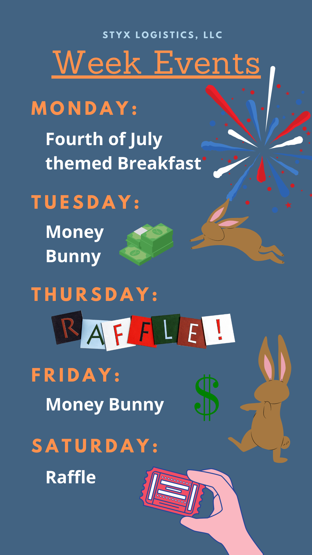 Also programmed for this week is our continued theme of the ‘Money Bunny’ and our ‘Raffles’. Be there to win!