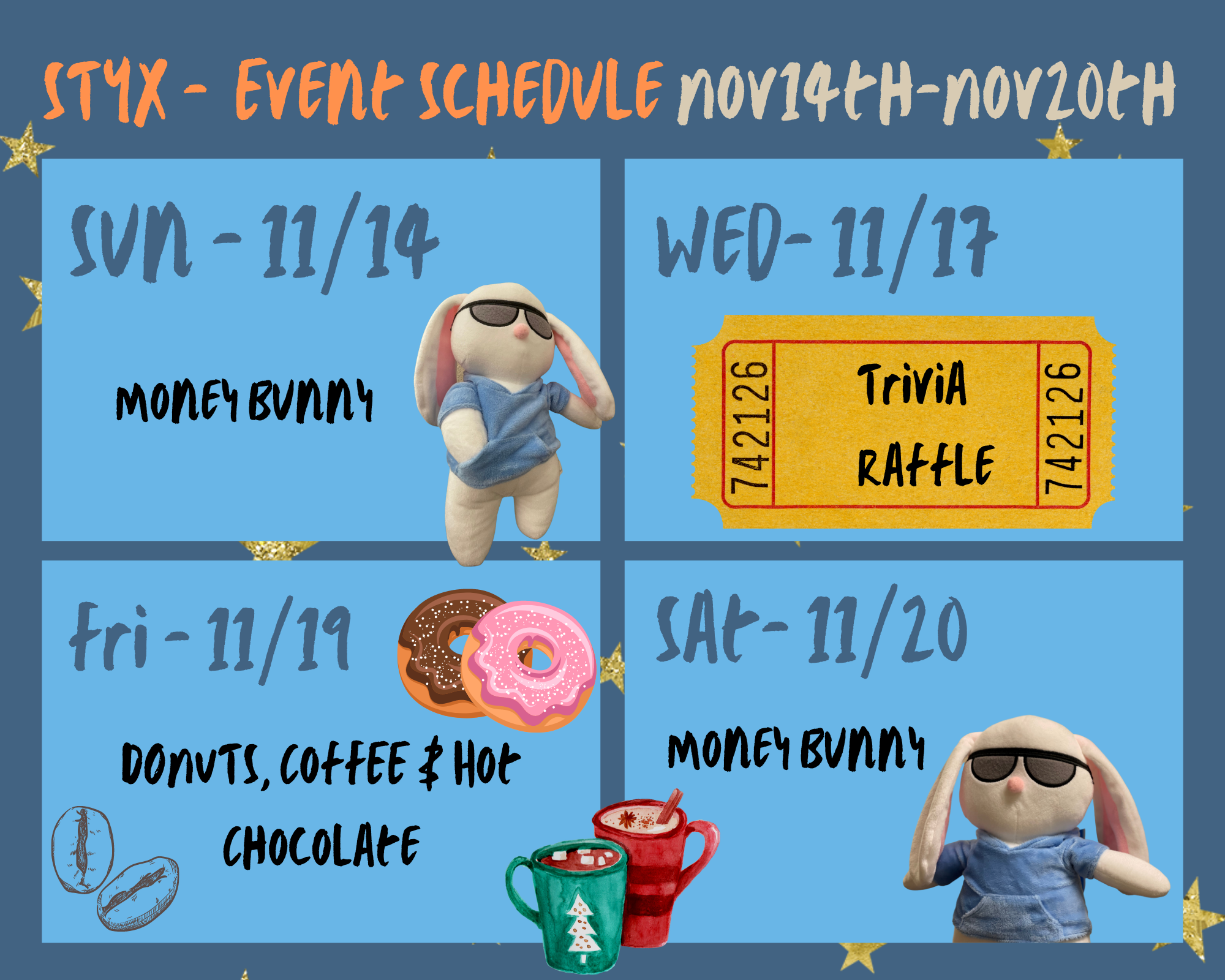 There is plenty going on at STYX Logistics as we roll closer to the Thanksgiving holiday season. For starters, we will be having MONEY BUNNY events on Sunday the 14th and Saturday the 20th of November – keep your eyes peeled for the shaded glasses! This Wednesday at startup we’ll also be playing TRIVIA RAFFLE, so keep all your trivia knowledge sharp so that you can win….
