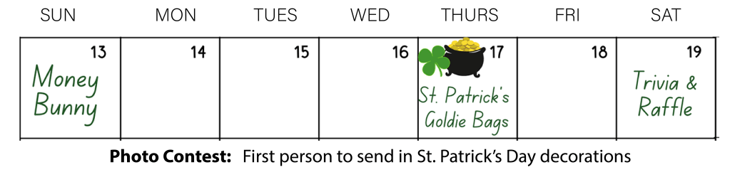 We’ve got a week of events here at STYX Logistics. To tip things off, we’ll be having a MONEY BUNNY day on Sunday, March 13th – good luck! Next off, we’ll be celebrating St. Patrick’s Day this Thursday, March 17th. Make sure to show up to the morning startup where we’ll be handing out St. Patrick’s Day Goldie Bags – may the luck of the Irish be with you! To close the week, we’ll be having another Trivia Raffle event on Saturday, March 19th. Good luck!