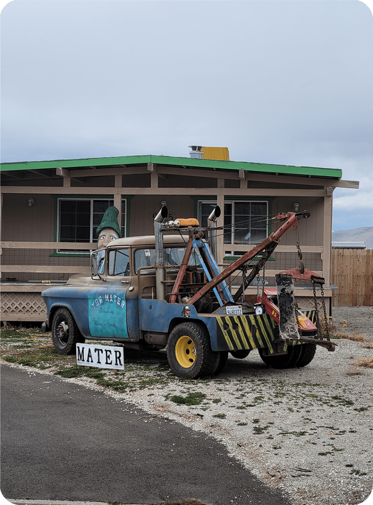 Another shout-out to Melissa Gardner for a superb piece of lawn art that she found. Did the movie (Cars) inspire the tow-truck or did the tow-truck inspire the movie??