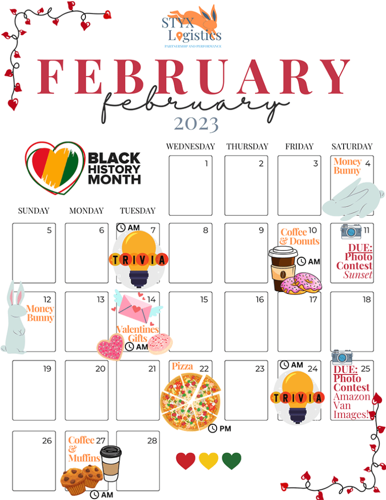 We have a action-packed week this week at STYX Logistics. To begin the week, we’ll be having a Food Event on Monday, February 27th. Show up to startup on time so that you can get your Muffins and Coffee. Next up, we’ll be having a MONEY BUNNY day on Friday, March 3rd – if you find the bunny with the shades in your tote, send in a picture of him to our Chime chat.